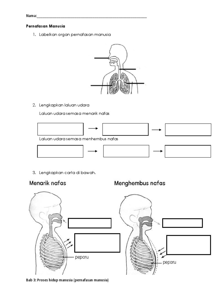 Menarik nafas menggunakan anak panah Menghembus nafas menggunakan anak panah b Lengkapkan laluan udara semasa menarik nafas dan menghembus nafas. 31 PROSES PENAFASAN MANUSIA. Organ yang terlibat semasa proses pernafasan ialah hidung trakea dan peparu.